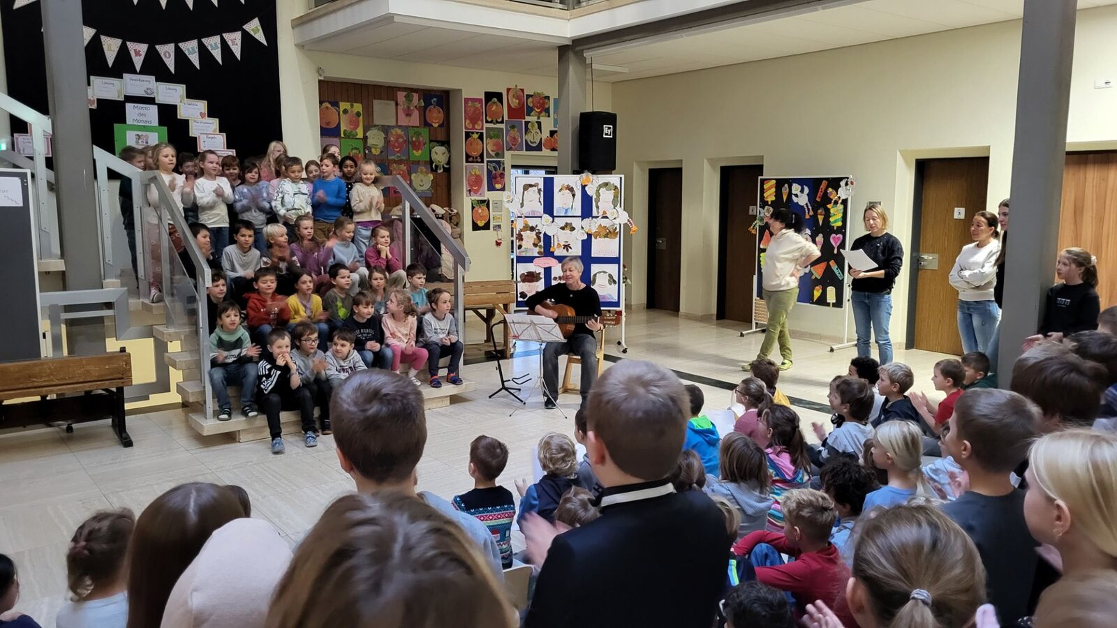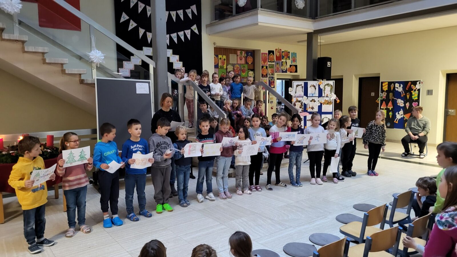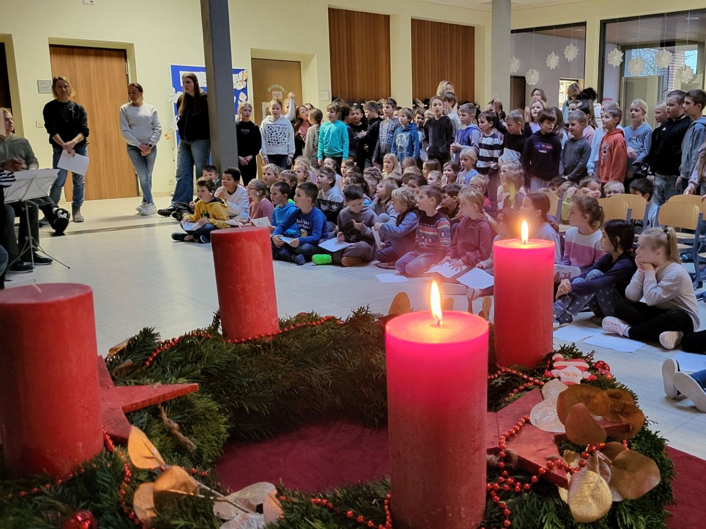 In unserer Schulaula traf sich die Schulfamilie zum montäglichen Adventssingen. Jeden Montag im Advent trägt eine andere Klassenstufe etwas vor: Lieder, Gedichte, Theater.